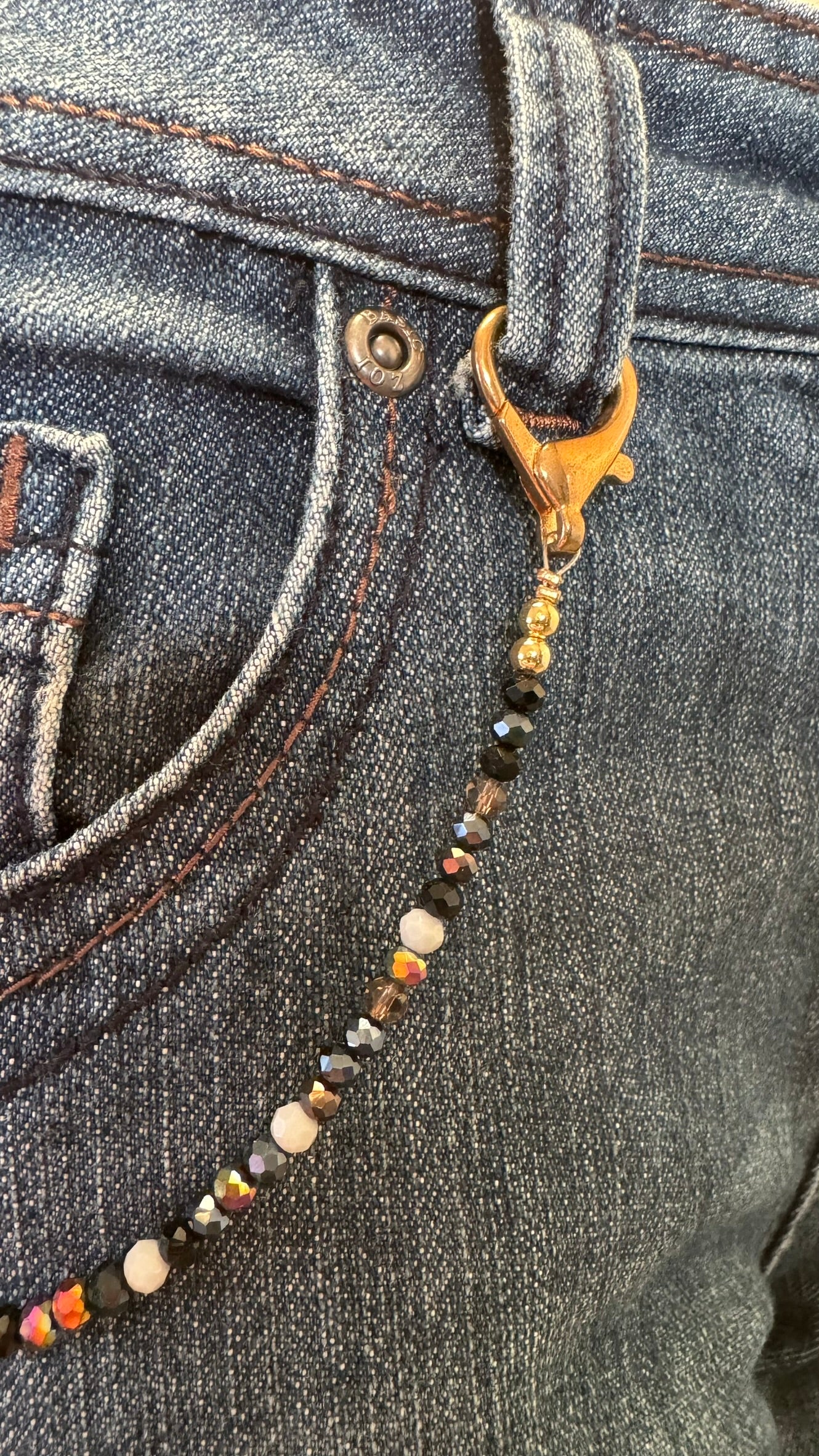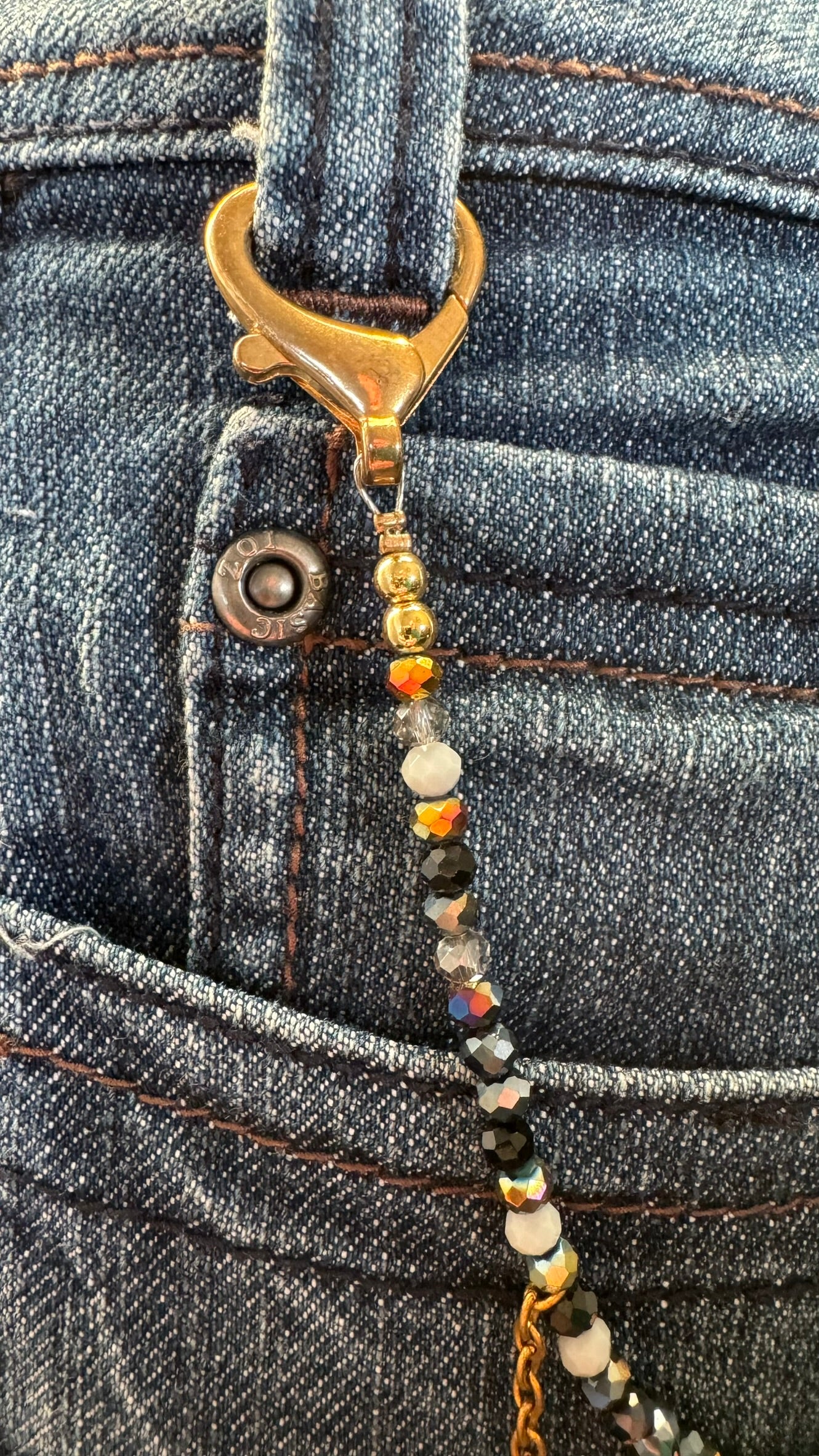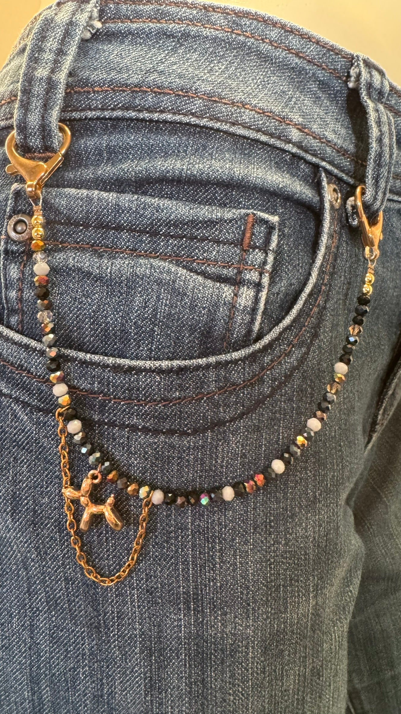 Het product bevat goudkleurige sluitingen, gecombineerd met een verfijnde mix van facetgeslepen kraaltjes in zwart, wit en warme metallic tinten. In het midden is een speels goudkleurig bedeltje in de vorm van een ballonhondje verwerkt, aangevuld met een subtiel kettinkje voor een extra stijlvol accent. Dit alles is zorgvuldig geregen op stevig staaldraad, waardoor het sieraad een luxe uitstraling heeft en prettig draagt, perfect als eyecatcher aan een jeans of tas.