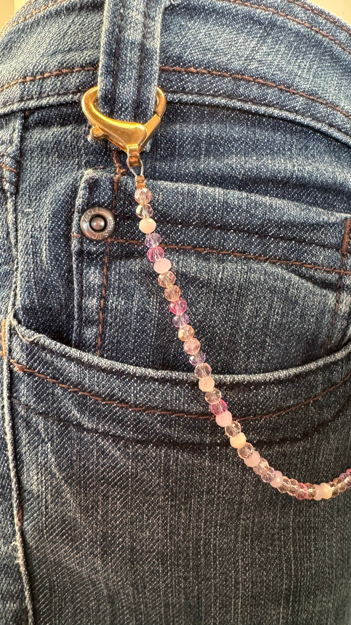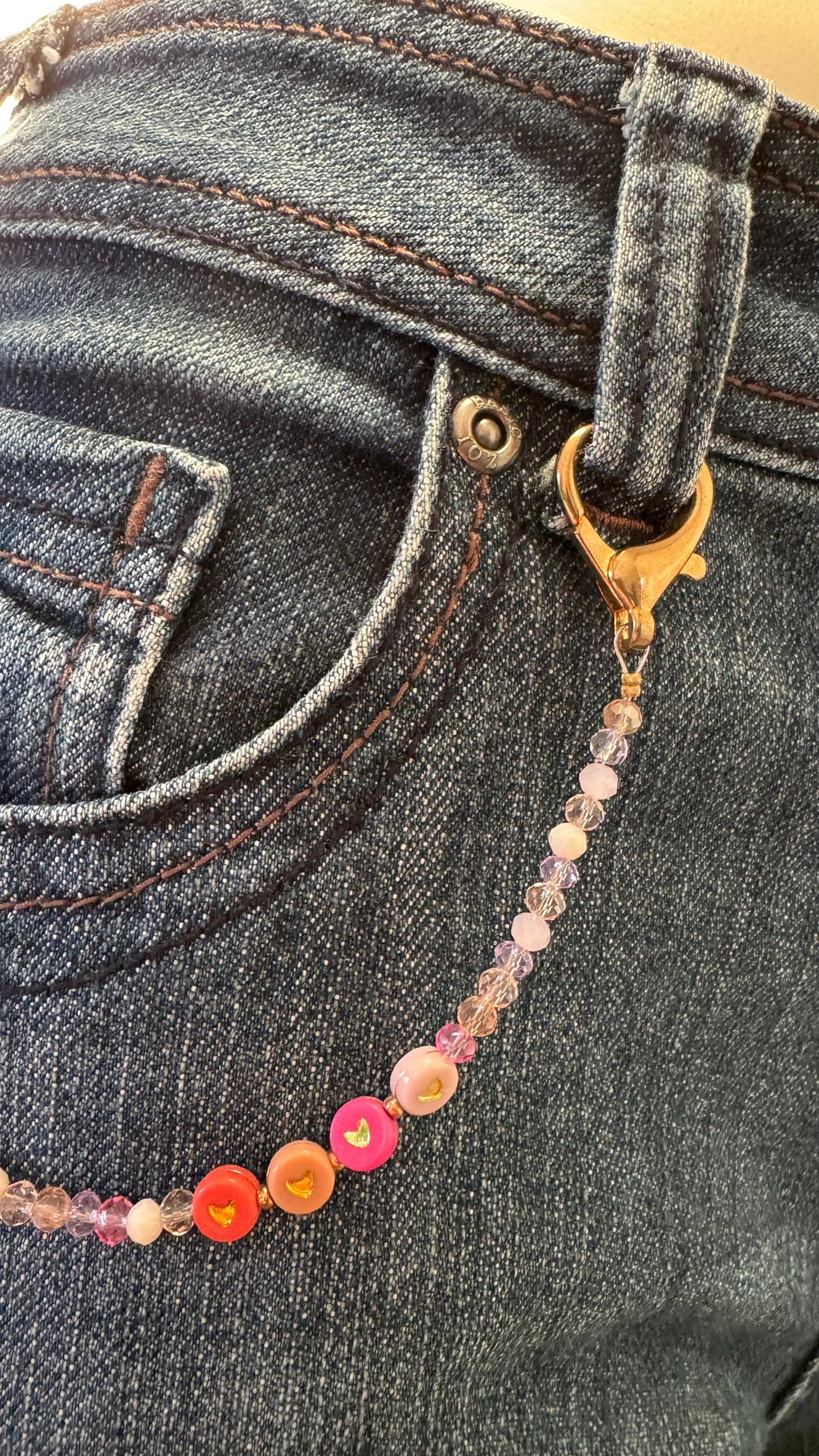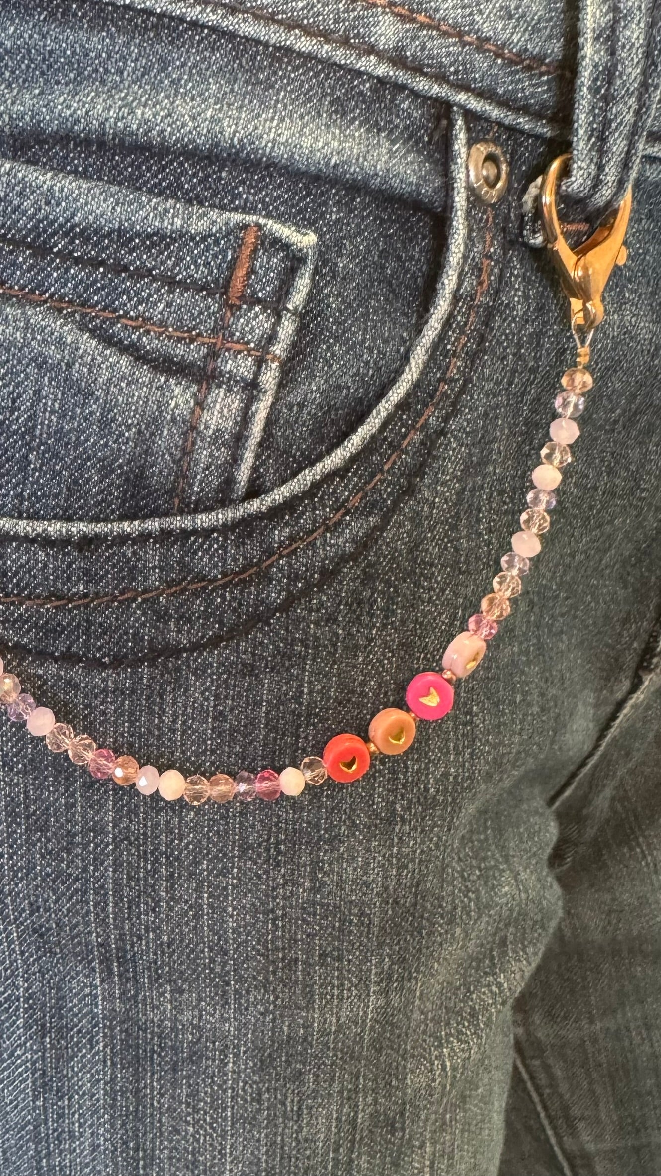 Het product bevat goudkleurige sluitingen in hartvorm, gecombineerd met een speelse mix van facetgeslepen kraaltjes in zachte tinten zoals roze, lila, champagne en transparant. Aan één zijde zijn subtiele hartjes-accenten verwerkt in warme kleuren, wat het sieraad een vrolijk en eigentijds karakter geeft. Dit alles is zorgvuldig geregen op stevig staaldraad, waardoor het geheel zowel elegant als duurzaam is.